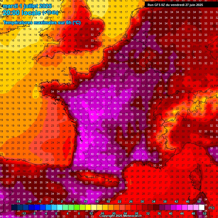 Qu'en sera-t-il de mardi ? Aucune évolution avec des conditions parfaitement ensoleillées qui s'accompagneront de températures caniculaires. Nous devrions nous situer autour de 37 à 39°C de manière généralisée avec des pointes de 40°C voire 41°C très localement. Outre ces maximales, les températures nocturnes s'annoncent aussi chaudes.
