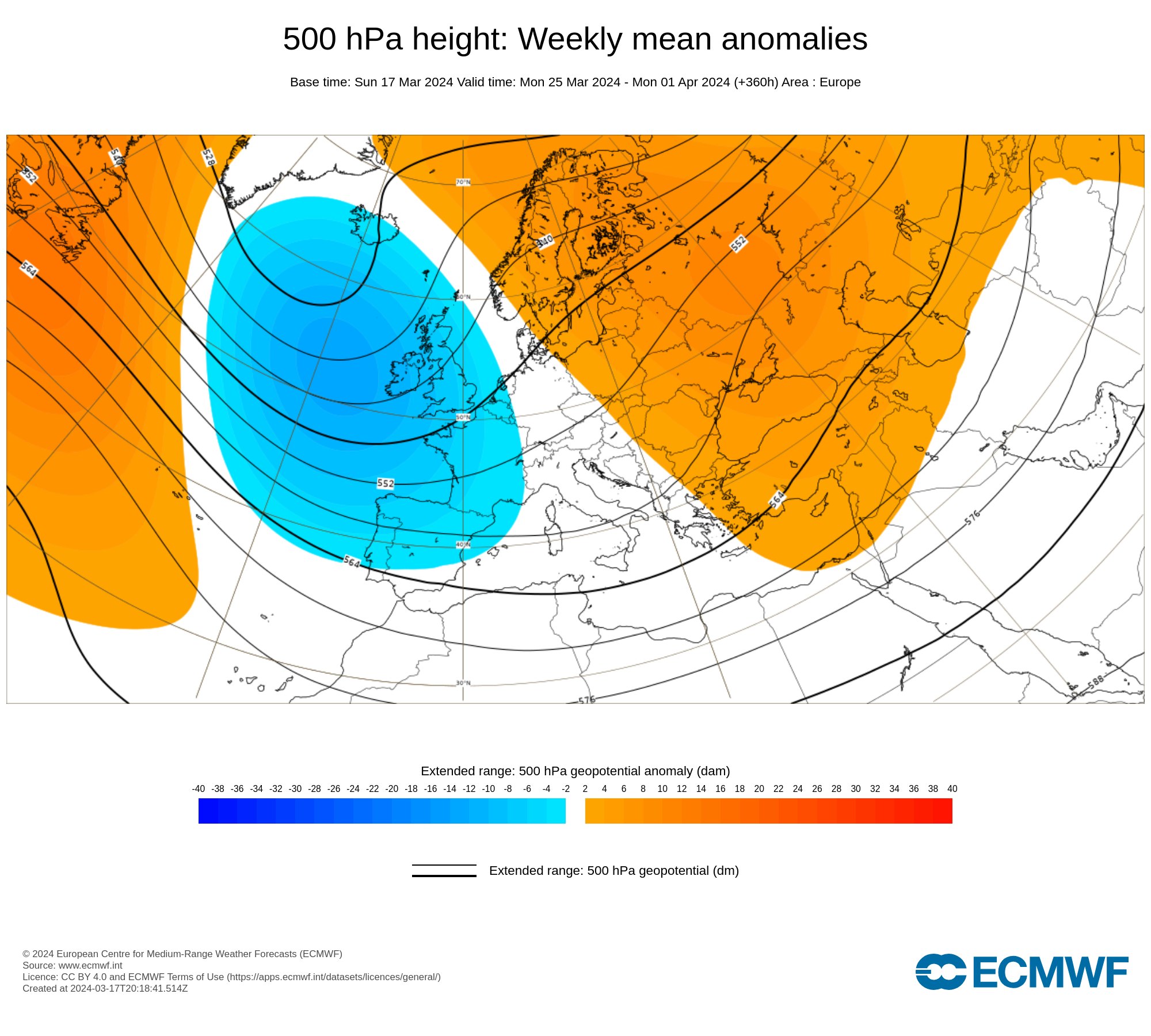 En a-t-on fini avec les gouttes froides ? Certainement pas. Le printemps comme l'automne est propice à ces petites dépressions qui circulent sur l'Europe. Plus nous avançons dans la saison et moins l'air froid qu'elles apportent est important. Les coups de froid se transforment en coups de frais voire en courte baisse des températures insignifiante. Ci-dessus, il s'agit d'une tendance pour la semaine du 25 mars au 1ᵉʳ avril. On remarque bien une anomalie dépressionnaire entre le Nord de l'Atlantique et la France.
