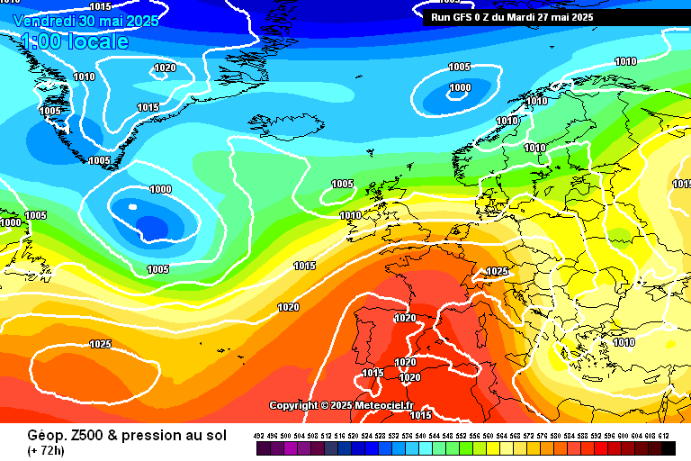 Le paroxysme de l'anticyclone va se produire ce vendredi. Les températures à 850 hPa (ce qui équivaut à environ 1500 m d'altitude) vont atteindre temporairement +16/+17°C dans le sud de la France et +20/+22°C en Espagne. Un épisode de fortes chaleurs va alors concerner le sud de la France. L'anticyclone devrait persister au moins jusqu'à dimanche, peut-être même lundi, puis nous surveillerons la formation d'une dépression au sud de l'Islande. Elle va se diriger vers le proche Atlantique. Pour le moment, il y a d'importantes incertitudes sur son emplacement et son dynamisme.