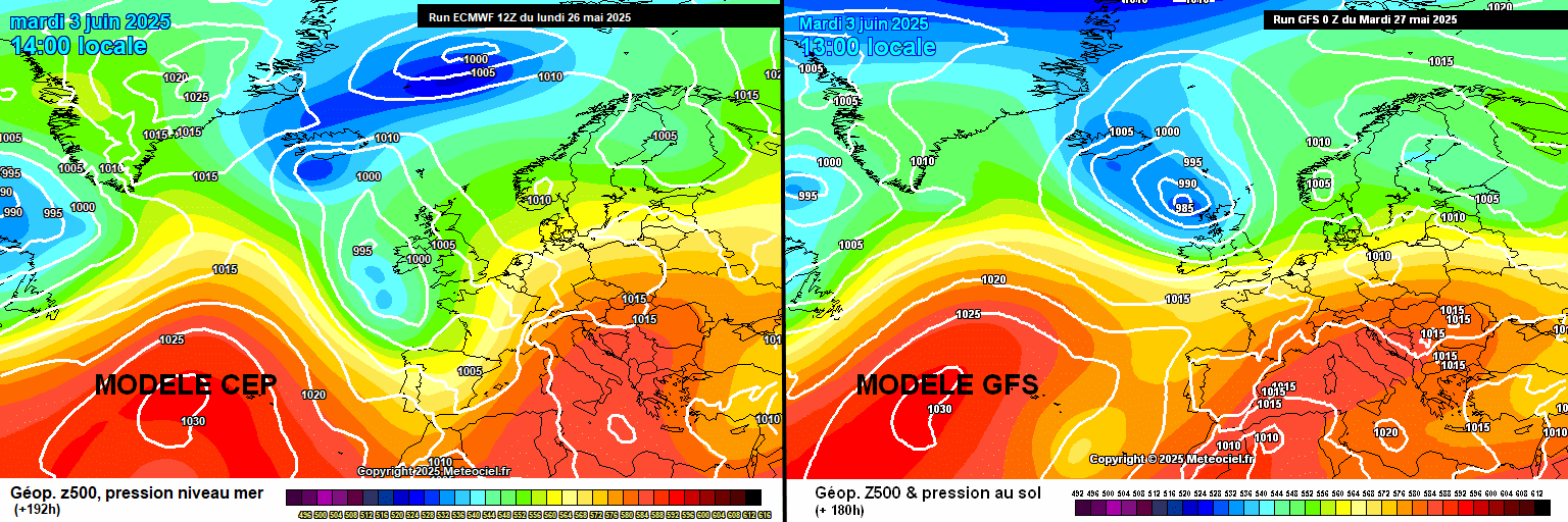 Autour du 3 ou 4 juin, les modèles divergent. Par exemple, on a CEP (modèle Européen) qui voit un axe dépressionnaire se positionner sur le proche Atlantique. S'il a raison, une vague d'orages violents touchera la France et pourra déborder sur nos plaines proches de la Méditerranée. Le modèle GFS (centre Américain) est quant à lui plus timoré sur le dynamisme de cette dépression ce qui donnerait des orages surtout sur nos reliefs et de rares débordements sur notre secteur. Les hautes pressions seront rapidement de retour à l'arrière.