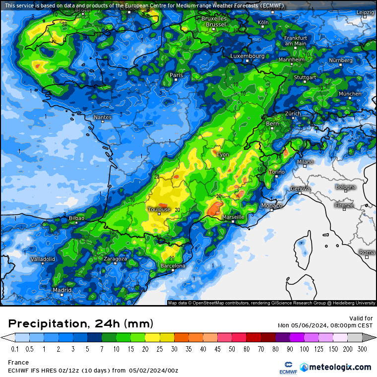 Les incertitudes sont grandes entre lundi et mardi. L'ancien complèxe dépressionnaire qui nous a affecté et qui s'est alors dirigé vers la Grande-Bretagne pourrait pivoter sur lui-même et se dynamiser passagèrement sur le proche Atlantique. Certains modèles voient l'anomalie plonger jusqu'à la Méditerranée, alors que d'autres voient une trajectoire plus au nord. On se dirige à priori vers une multiplication des passages nuageux avec de nouvelles pluies - d'assez faible intensité - possibles. Probabilité plus élevée entre l'Est du Languedoc et la Lozère, mais présente aussi entre l'Ouest du Languedoc et le Roussillon.