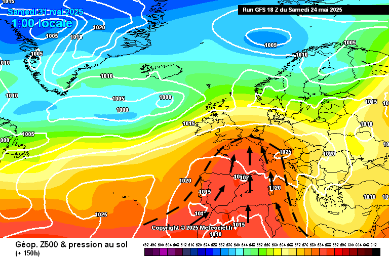 Ce dimanche 25 mai, le contexte météorologique est caractérisé par la mise en place d'un anticyclone entre les Açores, l'Afrique du nord, la Péninsule Ibérique et le sud de la France. Au même moment, un vaste système dépressionnaire circule au nord entre l'Islande et la Grande-Bretagne. Il s'agit d'une situation "classique" à l'approche de l'été où les hautes pressions au sud remontent progressivement vers le nord en repoussant l'activité dépressionnaire.