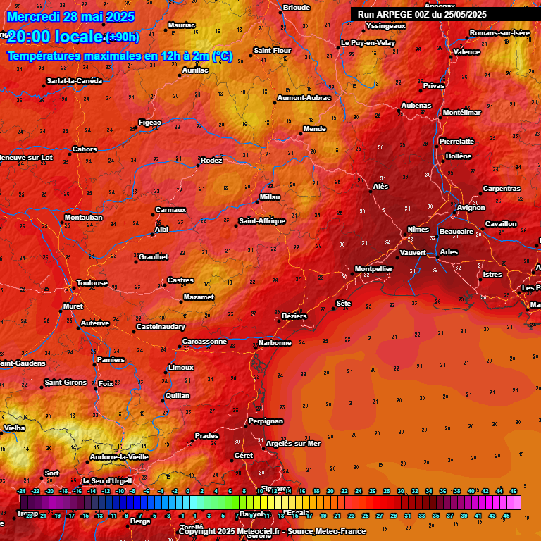 Ce lundi, le soleil domine en général malgré quelques nuages matinaux sur les reliefs et dans l'Ouest Audois. Mistral et tramontane atteignent souvent 40/50 km/h. Maximales de 26/27°C sur Roussillon à l'Aude, 27 à 29°C de l'Hérault au Gard. Mardi, grand soleil de partout. Le vent est moins prononcé, à 30/40 km/h en général. Les maximales montent souvent autour de 29/30°C sur nos plaines. Mercredi pourrait être la journée la + estivale de la semaine avec du soleil et le retour d'un vent de Nord-Ouest actif en deuxième partie d'après-midi. Les maximales pourraient se situer autour de 30°C sur le Roussillon et l'Aude, ainsi que l'Ouest Hérault. Foehn entre l'Est Hérault (Montpellier / Saint-Loup) et le Gard/vallée du Rhône avec 32 ou 33°C possibles.