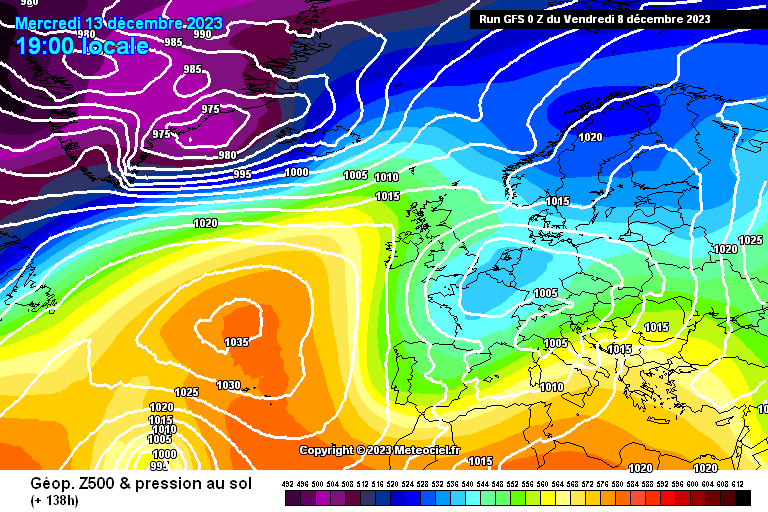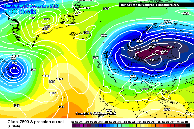 La carte ci-dessus n'est pas à prendre au pied de la lettre, bien entendu. Il s'agit du modèle GFS. Toutefois, cette option est reprise par le modèle saisonnier CEP qui voit un dôme de hautes pressions entre le Groenland et l'Islande autour de Noël. C'est un schéma favorable au "vrai hiver" en Europe avec une nuance on ne peut plus importante : on peut avoir de l'air froid qui concerne 70% de l'Europe sans nous atteindre de façon certaine, ou en nous atteignant de façon atténuée.