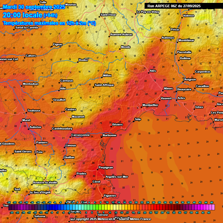 Mardi, les conditions ensoleillées se maintiennent mais avec un vent + présent puisque les rafales de mistral et de tramontane vont atteindre 50 à 60 km/h dans les zones exposées et autour de 30 à 40 km/h dans les couloirs moins exposés. Les températures restent très douces voires chaudes en journée : 20/22°C en vallée du Rhône mais souvent 24/25°C sur les plaines qui s'étirent entre Nîmes, Montpellier, Béziers, Narbonne et Perpignan. On a encore un bon 26/27°C du côté de Perpignan. Mercredi, toujours du soleil. Le mistral et la tramontane sont moins marqués que la veille. Les températures restent du même ordre que la veille, avec souvent autour de 23/25°C sur nos plaines.