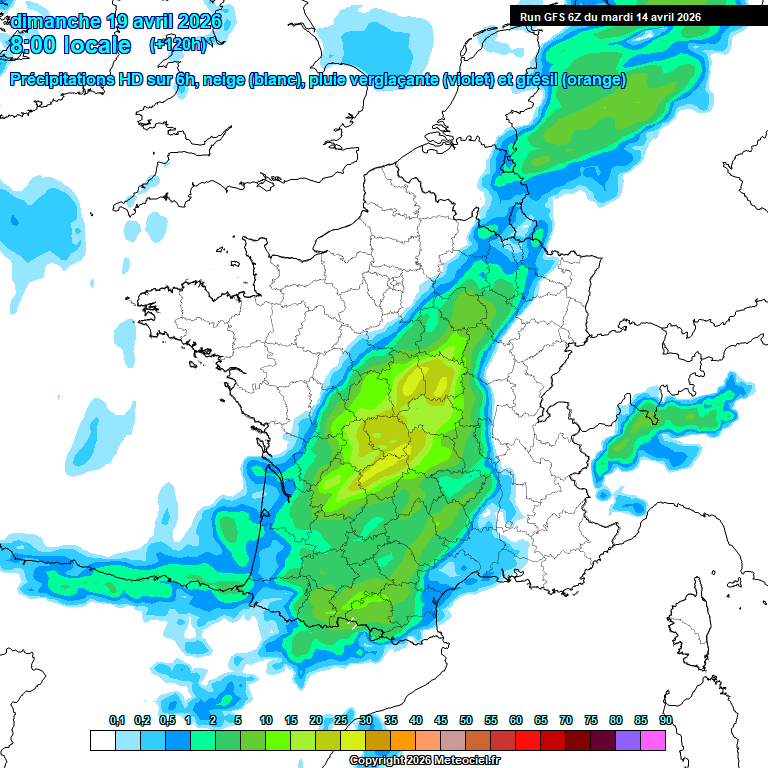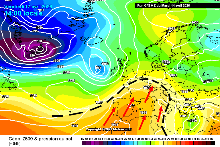 Nous sommes ce mardi 14 avril 2026 sous l'influence des centres d'actions suivants : à l'Est, près de la Corse, circule les restes de l'anomalie dépressionnaire qui nous a concerné hier. Au sud-ouest, vers l'Espagne, un anticyclone commence à se reconstituer. Demain mercredi, la petite anomalie se décale de la Corse vers le sud de l'Italie, en perdant encore de son dynamisme. Aussi, les hautes pressions Ibériques continuent de gonfler et amorcent un déplacement vers le sud de la France. C'est le début d'une période anticyclonique qui se confirme en France, particulièrement sur la moitié sud du pays, durant plusieurs jours.