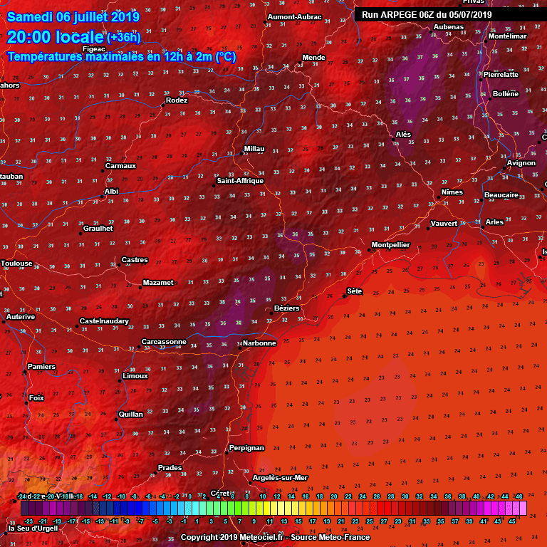 Sur les plaines intérieures, nous attendons environ 31°C à Montpellier, 32°C à Perpignan, 33 ou 34°C à Nîmes et Narbonne, 35°C à Carcassonne et Avignon. Quelques pointes à 36°C seront possibles près des Corbières ainsi que sur le haut-Gard. La série du nombre de jours avec T° > 35°C devrait conséquemment s'arrêter à Nîmes (10 jours). Dimanche, un nouveau coup de chalumeau est probable sur nos départements. Ci-dessous, voici la carte des températures prévues demain après-midi :