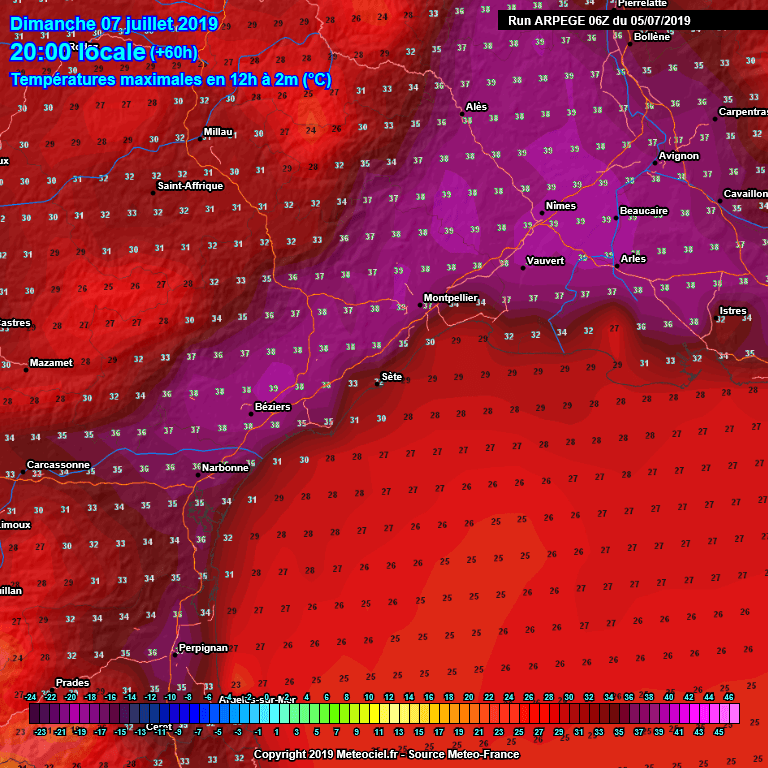 Quelques brises marines gagneront tout de même les plaines littorales en cours d'après-midi, notamment sur le sud Hérault et le sud Gard. Une convergence des vents va alors s'établir. Nous attendons dimanche après-midi de fréquentes pointes entre 38 et 39°C sous abri normalisé sur les départements de l'Hérault et du Gard, localement 40°C entre le Pic Saint-Loup et les plaines proches de Nîmes ! Pour information, les records absolus d'un mois de juillet sont de +37.5°C à Montpellier-Fréjorgues, +38.5°C à Béziers-Vias ou +38.8°C à Nîmes-Courbessac. Autant vous dire qu'ils sont menacés… !