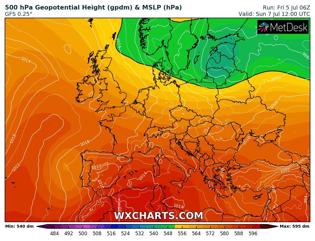 La mauvaise, c'est qu'un nouveau pic de très fortes chaleurs est attendu ce week-end, et que de nouveaux records mensuels (pour un mois de juillet !) sont menacés. Les régions Méditerranéennes vont rester ces 4 ou 5 prochaines journées sous l'influence d'une dorsale anticyclonique solide. Les températures à 850 hPa (soit l'équivalent d'environ 1500 m) resteront voisines des 20°C. C'est tout de même bien moins que les 30°C observés au même niveau il y a une semaine. Toutefois… les sols se sont asséchés et la chaleur s'est accumulée.