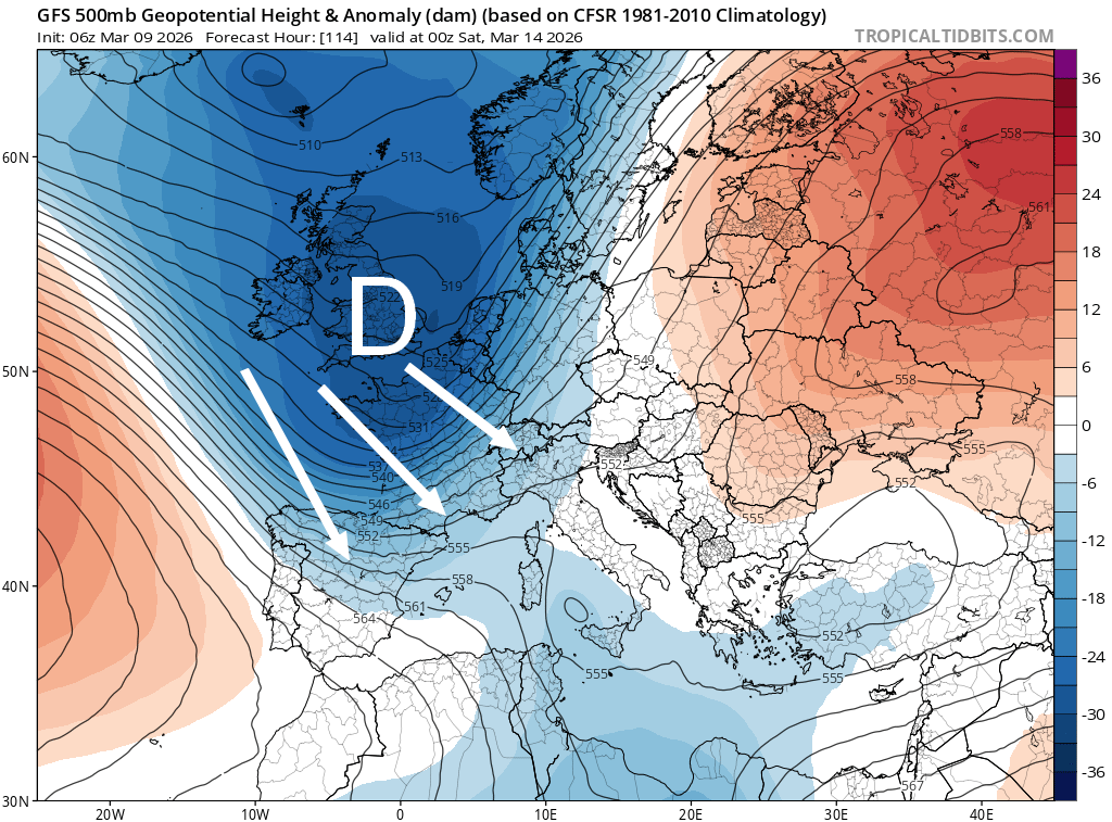 L'air froid gagnera du terrain en altitude. Le vent marin basculera au Nord/Nord-Ouest et cela engendra une nette baisse des températures. Dans ces conditions, la neige pourra faire son retour sur nos reliefs, parfois à basse altitude. Rappelons qu'il n'y a rien d'exceptionnel à avoir ces coups de frais au mois de mars. C'est plutôt la douceur actuelle qui est anormale (bien que la douceur soit limitée par les nuages).