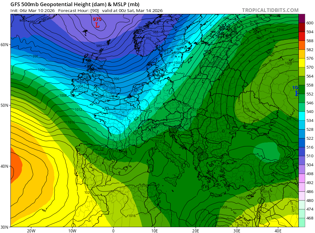 Jeudi, quelques passages nuageux élevés pourront circuler mais le temps s'annonce sec et assez ensoleillé. Le soleil sera encore présent vendredi matin mais la transition s'opèrera avec la multiplication des entrées maritimes en cours de journée. Il s'agira là des prémices de la dégradation attendue dans la nuit de vendredi à samedi. Comme on peut le voir sur la carte ci-dessus, nous devons cette nouvelle perturbation à l'incursion d'air plus froid sur le pays qui vient se confronter à la douceur déjà présente.