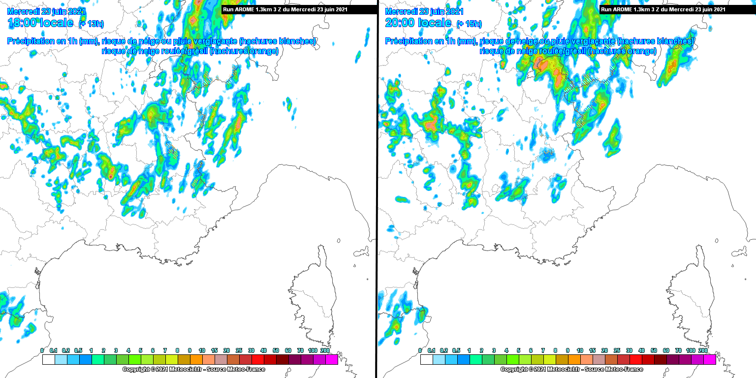 Pour les toutes prochaines heures, nos services surveillent un risque d'orages forts sur la Lozère, l'Est des Cévennes et le Haut-Gard (en limite avec l'Ardèche). La masse d'air, dotée d'une très forte instabilité atmosphérique avec des valeurs de MUCAPE voisines de 2000 J/kg et des indices de soulèvement < -3K, est en mesure de supporter la formation d'orages grêligènes et fortement pluvieux jusqu'en début/milieu de soirée. Des grêlons localement > 2 cm de diamètre et/ou des cumuls > 30 mm en 40 minutes sont à prévoir.