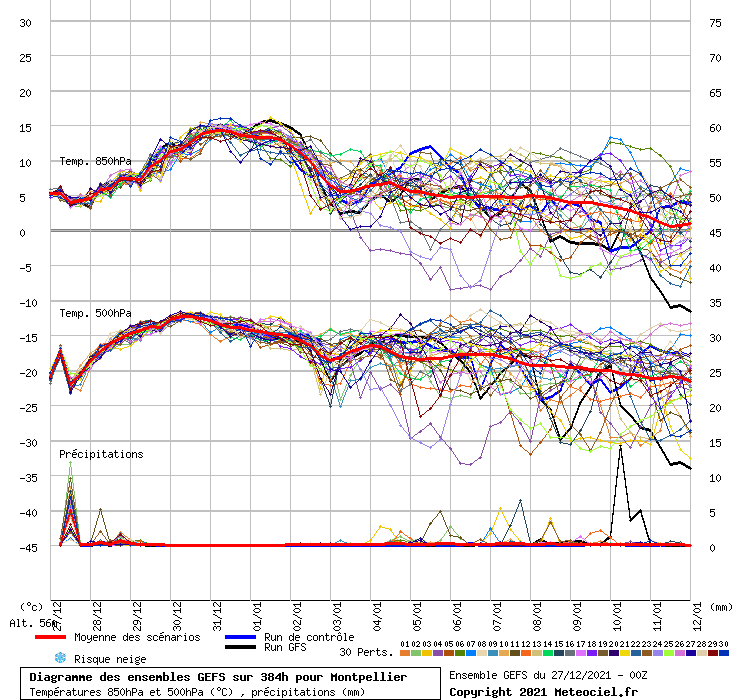 Le fort redoux va aussi concerner les reliefs. Vous pourrez skier dans les Pyrénées avec des maximales de 15°C sur les pistes en fin de semaine... Une baisse ordinaire des températures devrait ensuite de produire durant la première décade de Janvier, comme nous pouvons le voir sur les diagrammes ci-dessous (la courbe rouge représente la moyenne de tous les scénarios) :