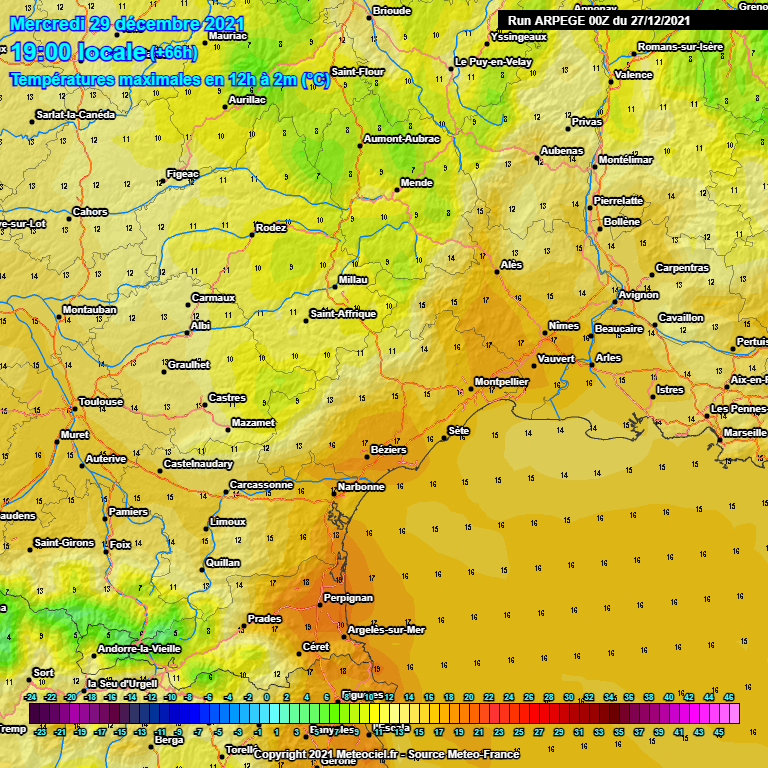 La hausse se fera sentir clairement dès ce mercredi 29/12. En effet, le soleil fera progressivement son retour durant cette journée, associé à un voile nuageux (foehn). Attention à la tramontane qui va momentanément se renforcer. Nous attendons des rafales de 80 ou 90 km/h sur l'Aude ainsi que sur les reliefs étirés de la Montagne Noire aux Cévennes en passant par l'Espinouse, le Caroux et la haute vallée du fleuve Hérault. Dans ce contexte, les minimales seront en hausse avec déjà 13 à 16°C sur l'Hérault, l'Aude et les Pyrénées-Orientales. Sur le Gard, les minimales seront plus fraîche en l'absence de vent, 6/7°C en général.