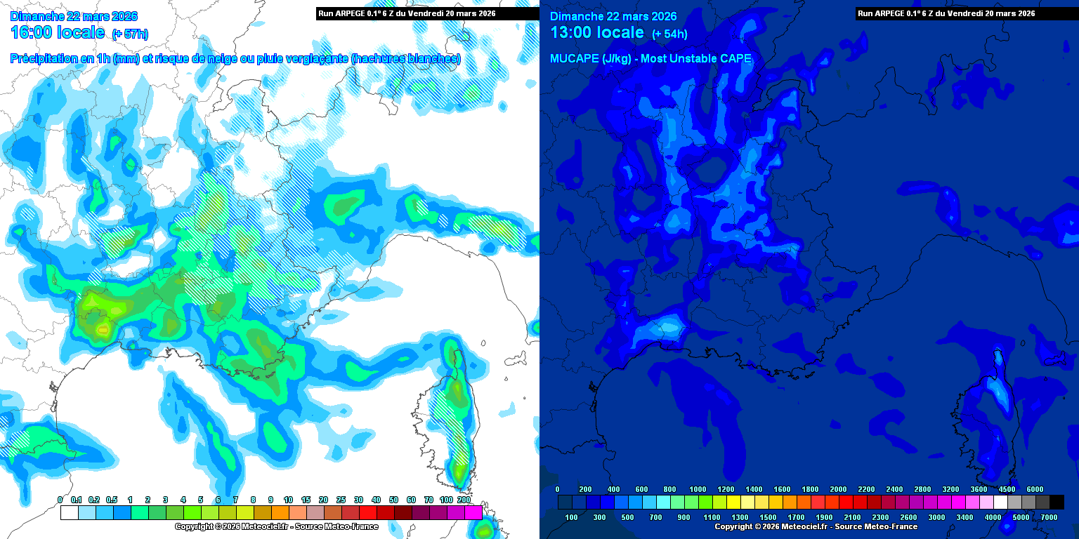 Sur les cartes ci-dessus, on voit bien que les précipitations seront nombreuses entre Gard et Hérault et seront corroborées à une faible instabilité (carte de droite). Rien de bien méchant en perspective mais cela devrait être suffisant pour avoir quelques coups de tonnerre sous les averses les plus musclées. On remarque que ces pluies s'annoncent plus rares sur l'Aude avant d'être de nouveau présentes sur le Sud des Pyrénées-Orientales. D'ici dimanche soir, Les cumulus devraient être 1 à 5 mm entre Aude et P.O., localement un peu plus près des Pyrénées.