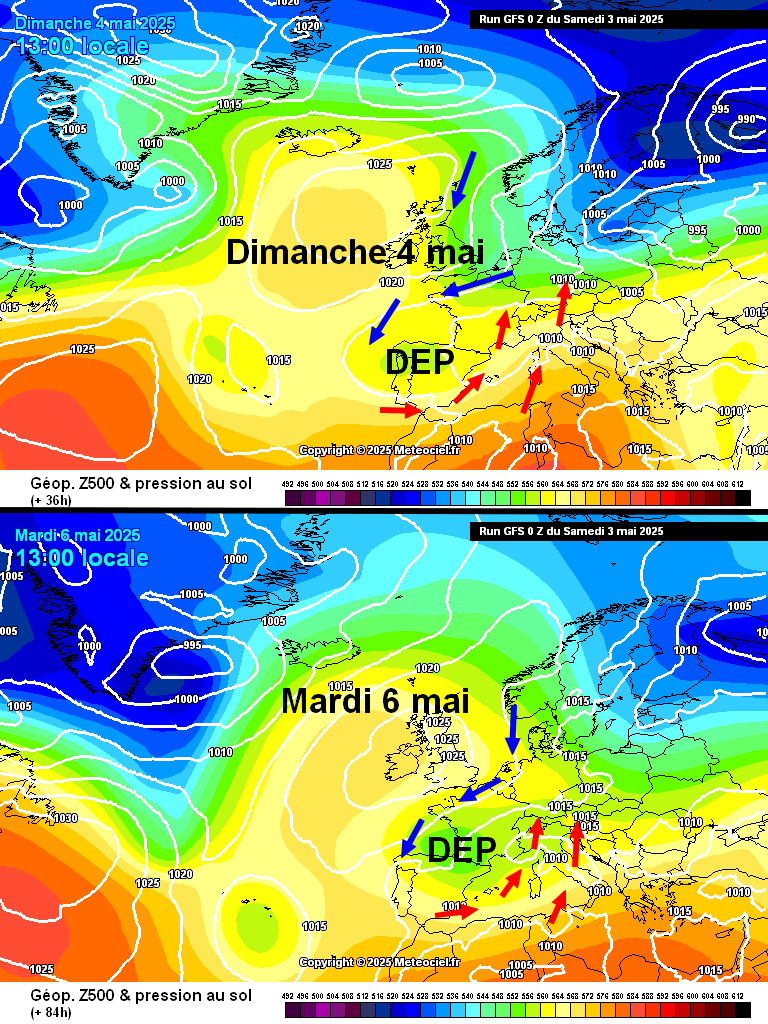 Demain dimanche, la petite dépression sur l'Espagne va se faire aspirer par les basses pressions positionnées sur l'Allemagne. Elle va alors se positionner à l'aplomb de nos régions Méditerranéennes, favorisant un contraste de masses d'air entre l'air doux/humide remontant de mer et de l'air plus frais advecté par le centre de la France. Entre lundi et mardi, une petite goutte froide va stationner sur la France. Elle induit la poursuite d'une petite instabilité dont nous détaillons les possibilités dans l'article ci-dessous.