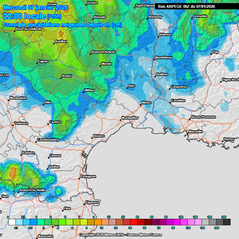 Les nuages gagnent aussi nos plaines. Quelques très faibles poches précipitantes vont déborder, notamment sur les plaines de l'Ardèche, Vaucluse, Bouches-du-Rhône, du Gard, de l'Héraut et de l'Aude, plus rarement encore des Pyrénées-Orientales. Compte tenu de la résistance de l'air froid notamment dans les couches moyennes et hautes de l'atmosphère, il est probable que ces petites averses soient sous forme de neige notamment sur l'Ardèche, le Gard et les environs de la vallée du Rhône, dès 200 m sur l'Hérault et l'Aude (peut-être même plus bas). On ne parle que de quelques flocons : pas de neige au sol ou d'un véritable épisode. Le modèle ARPEGE de ce midi favorise surtout l'axe Ardèche / Gard comme on peut le voir sur la carte des précipitations neigeuses (mais ce n'est pas à prendre au pied de la lettre, bien entendu) :