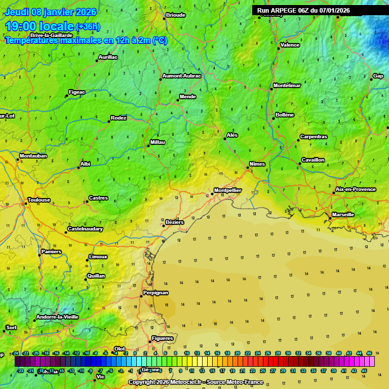 Il faut dire que le redoux est marqué ce jeudi après-midi puisqu'il ne gèle même plus sur les sommets de Lozère. La moitié nord du Gard conserve de la fraîcheur avec des maximales de 6 à 7°C mais on dépasse les 10/12°C à Nîmes et les 14/15°C de Montpellier à Perpignan. Redoux bien anticipé par le modèle ARPEGE notamment :