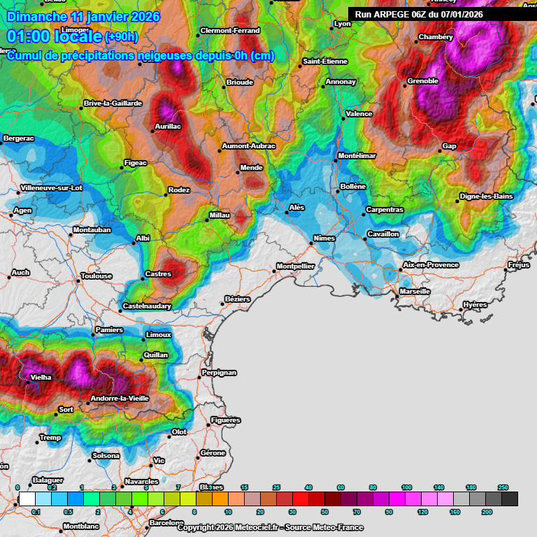 Samedi, encore des précipitations sur l'Ouest de la région de l'Aveyron aux Pyrénées et intérieurs Audois. Neige dès 500/700 m. Puis le temps se calme. Dimanche sera probablement plus ensoleillé, au moins sur nos plaines, avec à nouveau du gel blanc côté Languedoc, plus fort sur les sols enneigés de Lozère. Un temps plutôt conforme pour la saison... Sur la durée, les cumuls de précipitations neigeuses pourraient être significatifs tout de même :