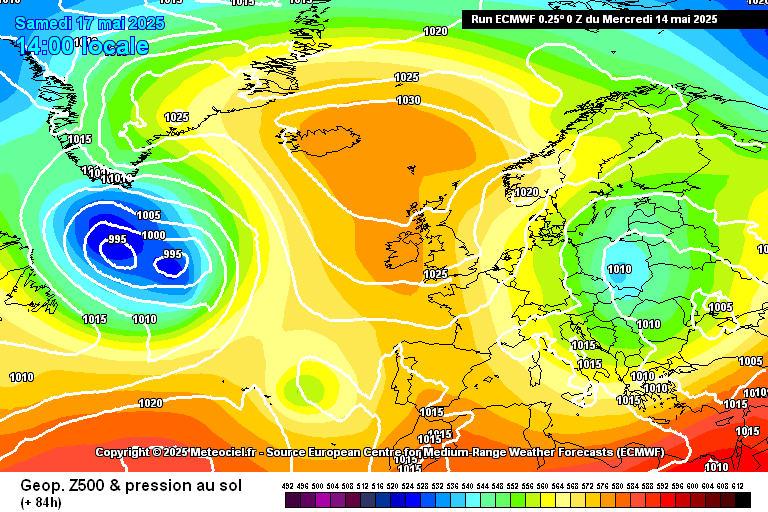 Cette goutte froide devrait stationner tout au long du week-end au large du Portugal, procurant une petite pompe à chaleur sur la France avant de progresser en début de semaine prochaine vers l'Espagne puis sur la France entre mercredi et jeudi. Elle va finir par fusionner avec un autre système dépressionnaire ancré sur les pays baltes en fin de semaine, avec la mise en place d'un flux du nord plus frais.