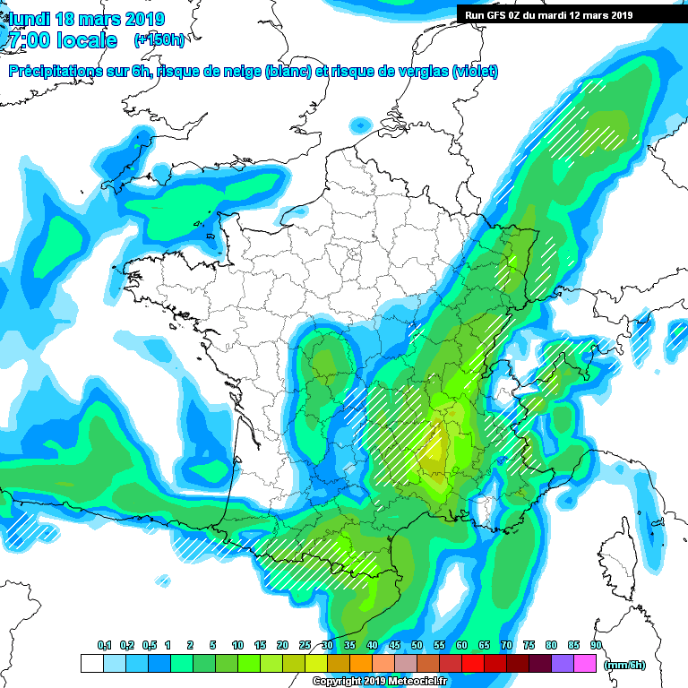 Ce contraste entre l'air doux en basses-couches et l'air froid en altitude est favorable à une déstabilisation relative de la masse d'air. Concernant le modèle GFS - dont vous pouvez observer la carte brute "précipitations sur 6h" à ne pas prendre au pied de la lettre - nous pouvons remarquer que la perturbation qui arriverait de l'Ouest se dynamiserait à l'approche du bassin Méditerranéen.