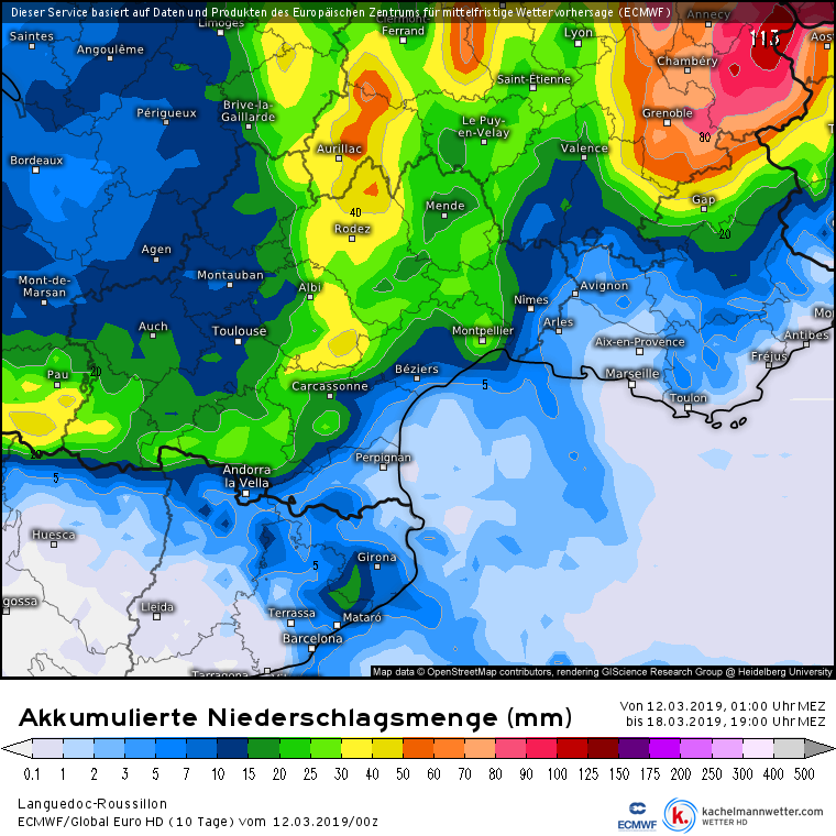 En plaine, il devrait s'agir de bonnes pluies surtout en se rapprochant du Languedoc et de la vallée du Rhône. Sur le Roussillon, par expérience, les cumuls risquent d'être revus à la baisse d'ici là : nous misons ainsi sur des pluies faibles. En altitude, près des reliefs, la neige pourrait (notez le conditionnel) tomber à moyenne altitude avec cette fois des quantités assez significatives, arrivant toutefois tardivement pour la saison. Sur ce modèle, le risque orageux est faible.