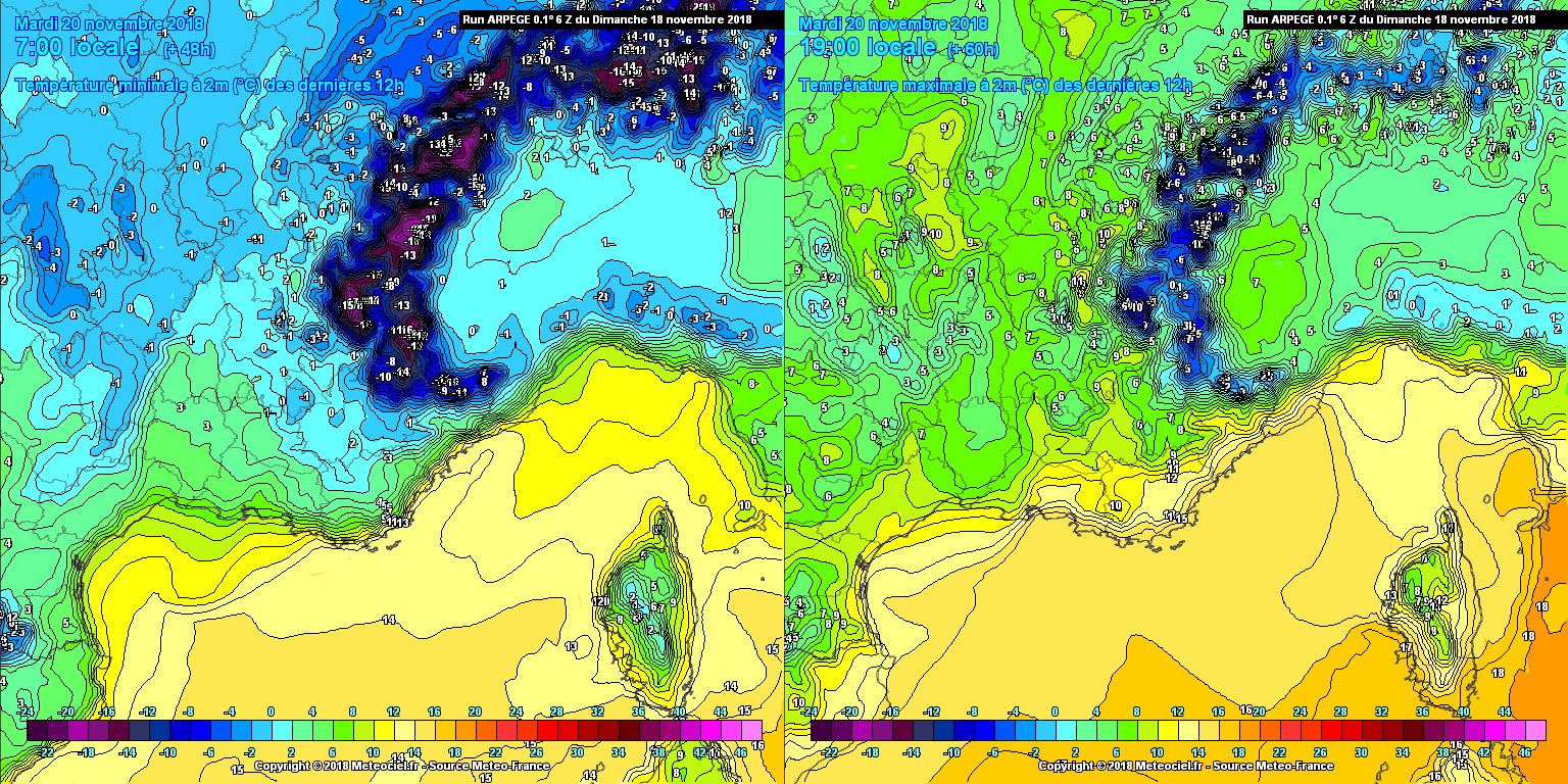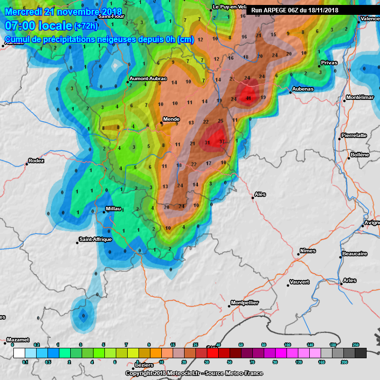Sur les reliefs, la couche de neige pourrait devenir assez importante comme en témoigne la prévision du modèle arpège ci-dessus (valeurs en centimètres). Plus généralement 10 à 20 cm sont prévus au-dessus de 1200 mètres et des pointes à plus de 30 cm sont probables sur les sommets du Mont-Lozère d'ici mercredi. Au final, le ressenti sera désagréable sur les plaines et littoraux avec un temps souvent maussade et des températures quasiment hivernales. Les nuages limiteront les gelées mais les maximales ne décolleront pas avec tout au plus 10°C dans le meilleur des cas.