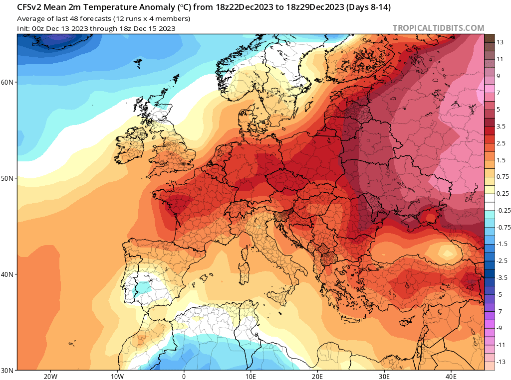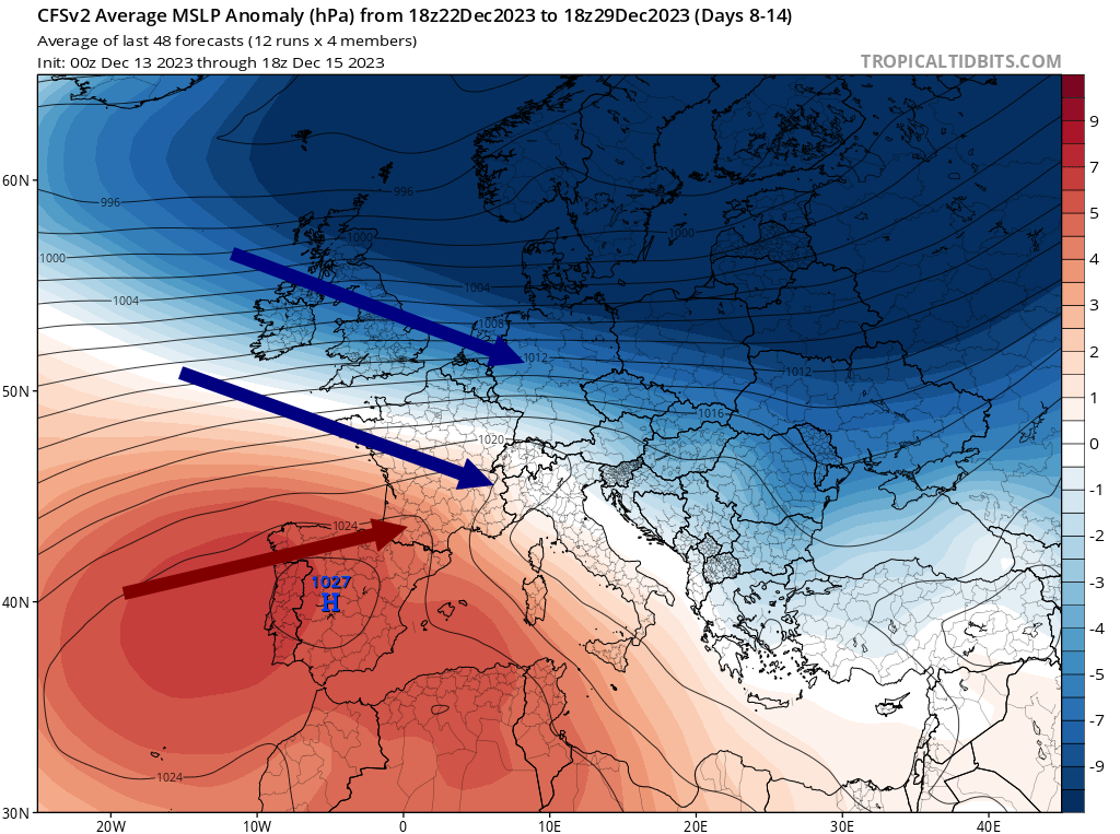 Sur les modèles dits déterministes (que nous utilisons pour le court terme), les scénarios divergent encore beaucoup pour la période de Noël. C'est pourquoi, nous illustrons nos propos avec un modèle à moyen terme ci-dessus reprenant l'anomalie de pression pour la période du 22 au 29 décembre. Le signal est assez net avec des hautes pressions qui devraient se positionner autour de l'Espagne tandis que l'axe dépressionnaire devrait circuler sur la Scandinavie.
