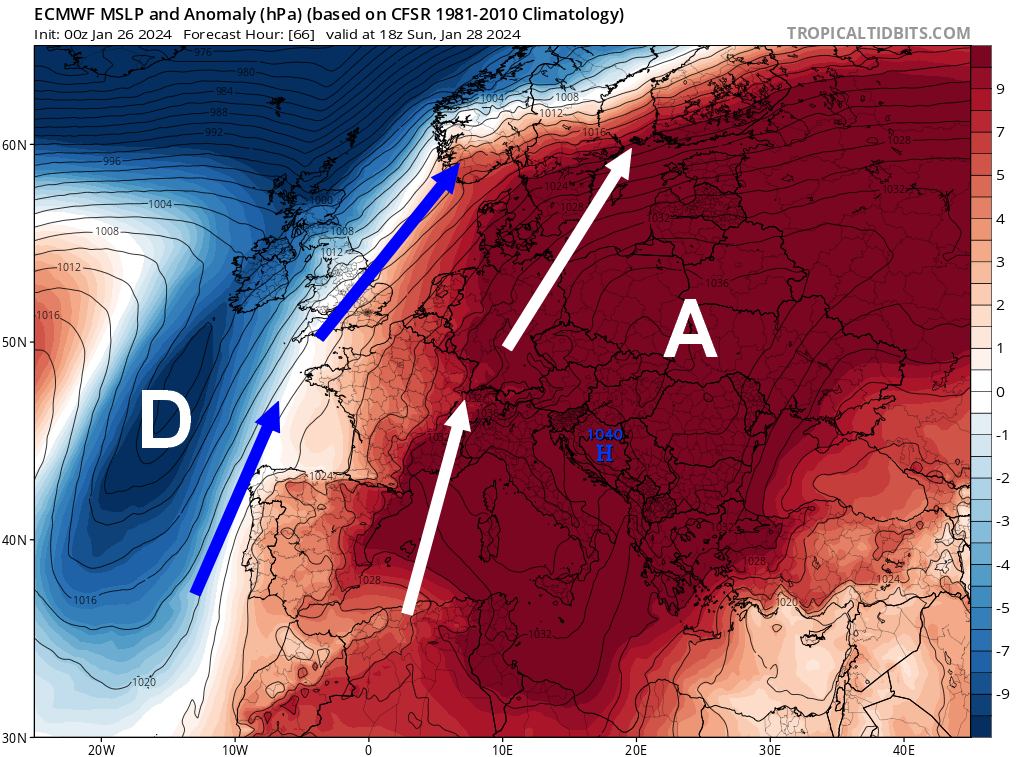 L'autre mauvaise nouvelle vient de la suite de la semaine. L'anticyclone devrait regonfler sur la France nous apportant un temps bien plus sec et probablement plus ensoleillé, le tout avec des températures toujours bien au-dessus des moyennes saisonnières. En conclusion, nous prenons ces petites pluies sous les entrées maritimes mais nous sommes loin d'une réelle dégradation bienfaitrice pour la nature. il faudra probablement attendre au moins jusqu'au 10 février pour espérer un changement de temps.