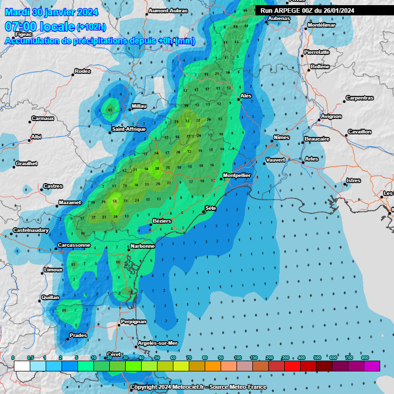 La carte ci-dessus représente l'accumulation de pluies d'ici mardi matin selon le modèle Arpège. Elle n'est pas à prendre au pied de la lettre mais elle démontre le potentiel de pluies sur l'arrière-pays de l'Hérault avec possiblement 30-40 mm sur les reliefs. Quelques petites pluies peuvent circuler en plaines sur l'Aude, l'Hérault ou l'Ouest du Gard mais cela restera anecdotique. Ces quelques millimètres en plusieurs jours n'auront aucun impact sur la sécheresse qui sévit sur notre région.