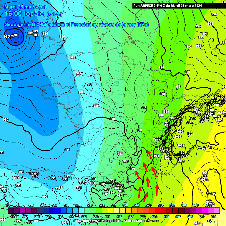 Nous sommes actuellement sous l'influence d'un vaste système dépressionnaire étiré entre l'Atlantique, la France, l'Espagne et toute la Méditerranée. Dans les prochaines heures, un petitccreusement méso-dépressionnaire secondaire va se constituer. On le retrouve sur l'Hérault cet après-midi, avec une pression atmosphérique s'abaissant vers 988 hPa. Ce soir et la nuit prochaine, cette petite dépression se décale vers la Provence, mais elle est suivie d'une goutte froide dépressionnaire qui arrive par l'Ouest.