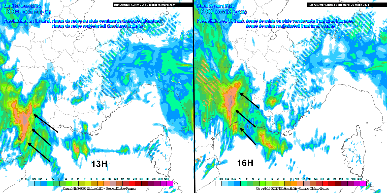 Cet après-midi, des axes fortement pluvieux remontent sur l'Hérault. Ils touchent aussi bien le littoral, que les plaines/arrière-pays et les reliefs. Les intensités atteignent temporairement les 20 à 25 mm/1h ce qui est significatif pour une pluie "d'hiver". Ces axes pluvieux débordent en cours d'après-midi vers l'Ouest Gard et les Cévennes, entre le Vidourle, la haute Gardonnenque, le pays du Vigan et jusqu'aux contreforts sud du Mont-Lozère. On prévoit des cumuls conséquents sur cette première phase : 50 à 100 mm de plus sur les reliefs et parfois 40 à 70 mm sur les plaines (caractère hétérogène lié aux axes étroits). Des pluies touchent aussi l'Est Gard et le nord Lozère, mais c'est moins marqué à cet instant et plus irrégulier. Il neige vers 1500/1600 m sur le Mont-Lozère.