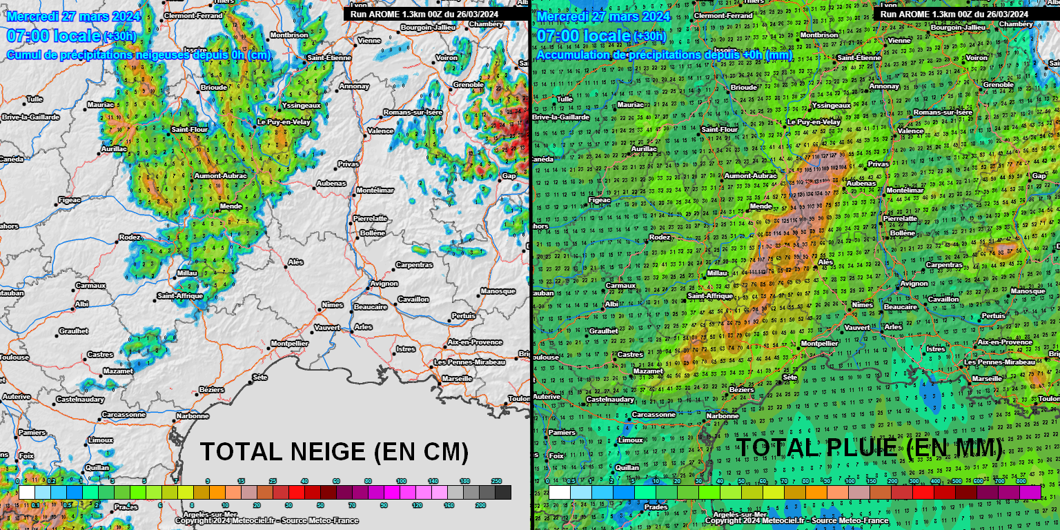 L'épisode devrait tenir ses promesses entre le Nord-Est de l'Aude (30 à 50 mm) et l'Hérault (souvent 40 à 60 mm en plaines, 60 à 80 mm dans l'arrière-pays & loc. 100 mm, 100 à 150 mm sur les reliefs). Sur le Gard, on prévoit 20 à 30 mm le long du Rhône et jusqu'à 80 mm sur le piémont, 100 à 150 mm sur les Cévennes. Les plus forts cumuls peuvent se produire en limite du Gard, de la Lozère et remontant jusqu'au plateau Ardéchois avec 130 à 170 mm dans les secteurs bien exposés. Il est à noter que les petites pluies s'attardent demain jusqu'en milieu de matinée sur l'Est du Gard.