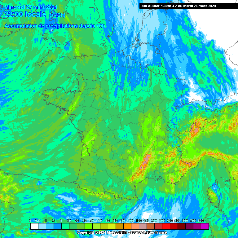 Les cours d'eau cévenols vont réagir avec des crues modérées sur l'Hérault, le Gard, la Lozère et l'Ardèche. Ces dernières devraient rester un bon cran en dessous des précédentes toutefois. Ci-dessous, voici l'accumulation prévue par la dernière actualisation du modèle Arôme :