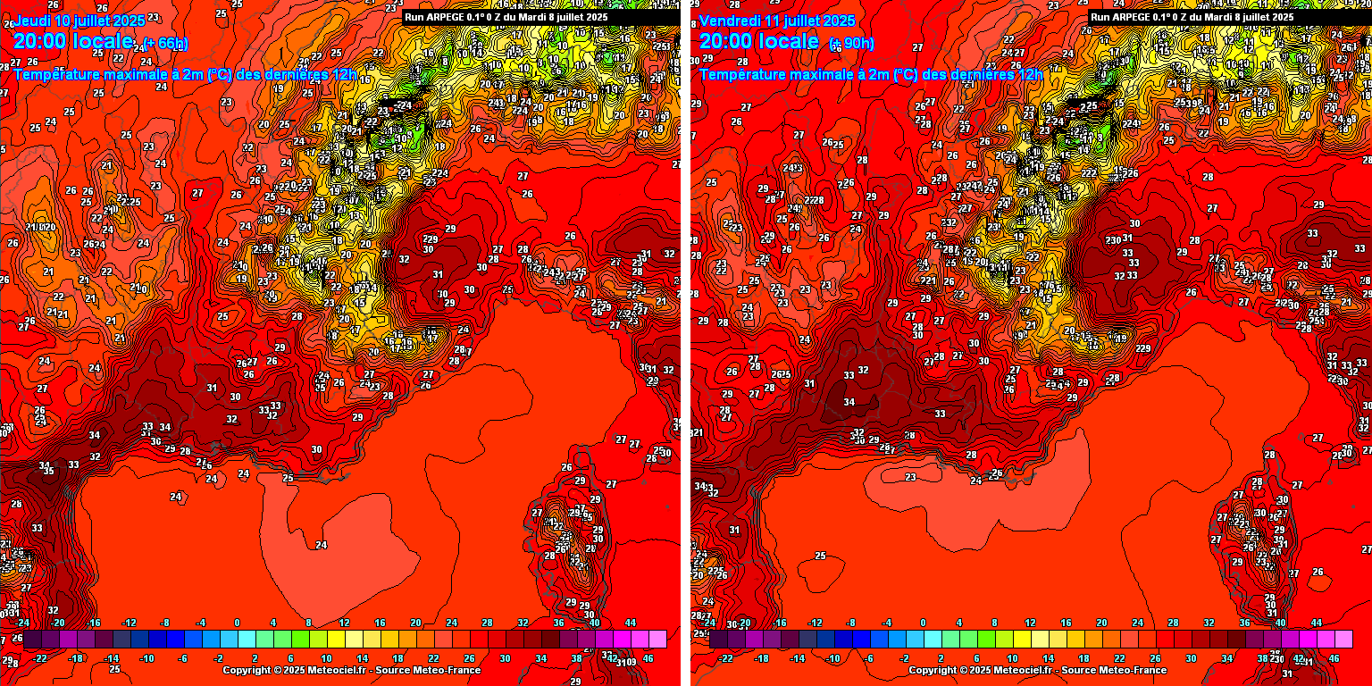 Dès ce mercredi, les maximales vont repartir à la hausse. Nous aurons encore une matinée fraiche mais le thermomètre va bien grimper au fil de la journée. Alors que nous étions généralement sous les 30°C en ce début de semaine, nous allons repasser au-dessus avec jusqu'à 32 ou 33°C dès ce mercredi. Cette hausse va se poursuivre jeudi et vendredi avec 33 à 35°C et surtout un vent de terre qui va perdre du terrain au profit d'un vent marin qui viendra rehausser le taux d'humidité et donc le ressenti. Bien qu'au-dessus des moyennes de saison, rien d'exceptionnel en prévision, d'autant plus que les minimales resteront respirables.