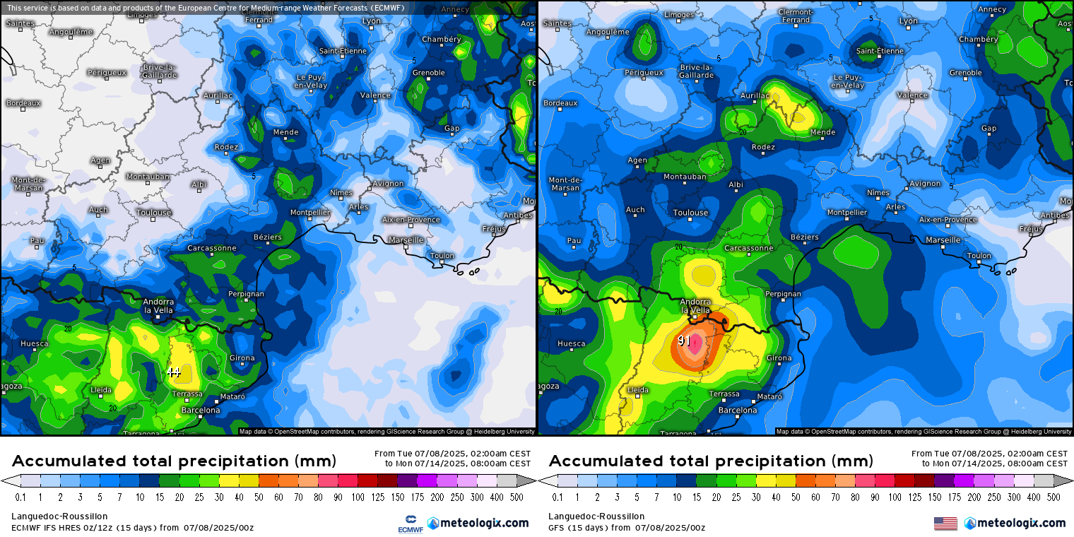 Les cartes ci-dessus représentent l'accumulation des pluies sur notre région d'ici lundi. La carte de gauche provient du modèle CEP et celle de droite du modèle GFS. On remarque un certain accord entre ces deux principaux modèles avec des précipitations qui concernent une grande majorité de la région. Toutefois, ces modèles possèdent une maille assez large qui exagèrent l'étalement des orages. Les disparités pourraient être plus importantes.