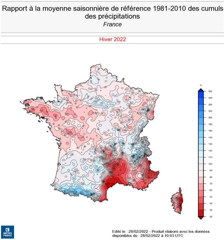 Comme vous le savez, depuis le 1er mars nous sommes entrés dans le printemps météorologique. Cela nous permet de faire un petit bilan de l'hiver 2021-2022. Si les gelées ont été parfois nombreuses, l'hiver a été particulièrement monotone sans événement notable comme un épisode neigeux en plaines. Le fait marquant de cet hiver se résume en une sécheresse hivernale marquée dans le Sud-Est de la France et plus particulièrement sur notre région, la faute à un anticyclone solidement ancré sur le pays.
