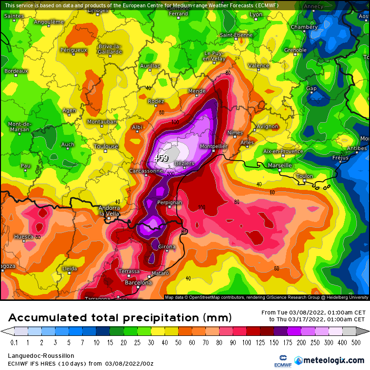 Des scénarios extrêmes commencent à sortir sur plusieurs modèles avec d'importantes accumulations de pluie qui se feraient en plusieurs épisodes pluvieux successifs entre ce week-end et la semaine prochaine. Cela sera les conséquences d'une importante goutte froide qui pourrait plonger sur l'Espagne. Au vu de l'échéance, le scénario précis reste à affiner car un simple décalage de cette goutte froide peut influencer l'intensité des précipitations mais aussi la localisation de ces pluies.