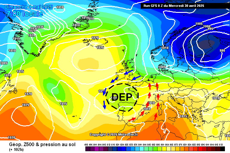 En ce dernier jour d'avril, une dépression relativement dynamique évolue entre les Açores et le Portugal. Elle fait office de "pompe à douceur" en soulevant un flux de sud entre l'Afrique du nord, la Méditerranée, la France et la Grande-Bretagne. Ces hautes pressions nous permettent de profiter d'un temps plus stable pendant quelques jours. On voit néanmoins sur les modélisations que la dépression va peu à peu se décaler vers l'Est. Vendredi, elle atteindra le Portugal.