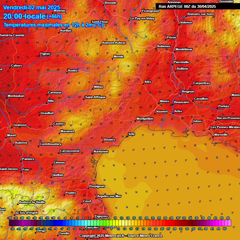 Les températures maximales vont gagner un petit degré par rapport à ce mercredi. Elles pourront atteindre jusqu'à 26/27°C surtout dans l'intérieur du Gard mais aussi côté Roussillon (foehn). Vendredi, on sent que la dépression se rapproche du Portugal car le flux marin se dynamise et le soleil se voile de plus en plus au fil de la journée. C'est le début (lent) d'un changement de temps. Les températures maximales atteignent encore 21/22°C en bord de mer, plutôt 23/25°C dans l'intérieur des terres et jusqu'à 26/27°C toujours du côté du Gard.
