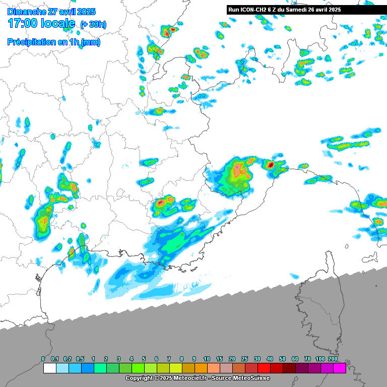 Dimanche, la goutte froide se trouve en Méditerranée, engendrant un flux d'Est sur notre région. Le ciel devrait se montrer généralement gris. Si la couverture nuageuse pourra se montrer un peu plus fine dans l'après-midi, l'atmosphère pourra se réchauffer et occasionner le développement de nombreuses averses, notamment sur les reliefs de la haute-Provence et des Cévennes. Avec un dynamisme résiduel, ces averses pourront déborder sur les plaines de l'arrière-pays provençal, mais également sur les zones entre l'ouest du Gard et l'Est de l'Hérault, jusque sur les zones littorales. L'instabilité ne sera pas très importante, mais ces averses pourront adopter localement un caractère orageux, sans virulence particulière.