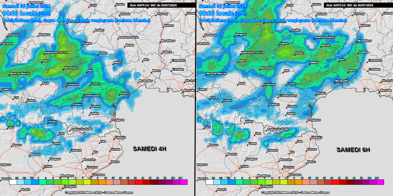 On a déjà un risque d'orages qui apparaît en cours de nuit prochaine. En effet, une première petite anomalie va circuler des Pyrénées vers la Lozère. Elle est associée à une instabilité atmosphérique modérée. Dans ce contexte, des orages vont débuter en milieu de nuit autour de l'Ariège et déborder rapidement dans l'intérieur de l'Aude. Ces orages se dirigent ensuite vers l'Espinouse/Montagne Noire, Aveyron, Cévennes et Lozère où ils sont assez étendus bien que peu virulents. On souligne toutefois que des averses orageuses peuvent aussi déborder sur les basses plaines de l'Aude, de l'Hérault et plus tardivement en fin de nuit du Gard. Ces orages sont généralement d'une intensité ordinaire. Ils donnent de faibles cumuls sur les plaines, mais parfois 10/15 mm près des reliefs ou plus localement dans l'intérieur des terres. Comme toujours : des communes seront totalement épargnées ! (loterie liée à la trajectoire imprévisible des averses orageuses).