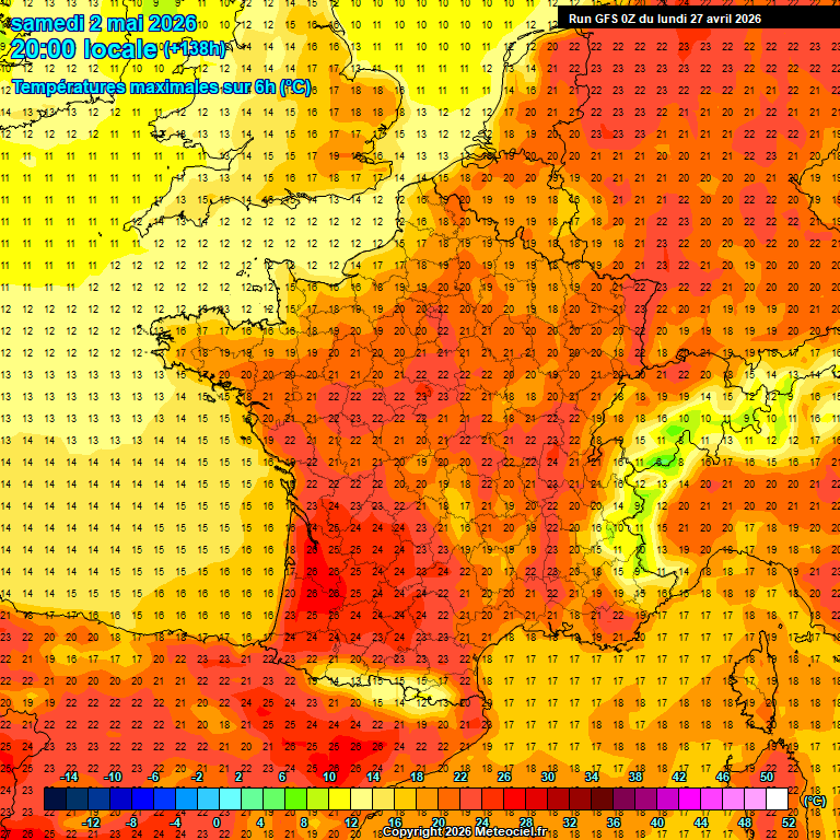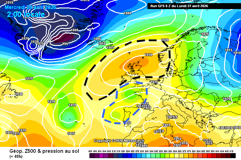 Nous sommes ce lundi 27 avril sous l'influence d'un anticyclone des Açores à l'Islande et qui déborde aussi entre l'Afrique du nord, la Péninsule Ibérique et le sud de la France. Une petite goutte froide dépressionnaire circule en mer de Norvège. Elle va glisser vers les côtes de la Manche d'ici demain mardi puis vers le proche Atlantique en nuit de mardi à mercredi. Mercredi, un dôme anticyclonique s'isole sur le nord des Îles Britanniques. La petite goutte froide dont on parlait juste avant prolonge alors son influence jusqu'au nord de l'Espagne. Elle favorise une bascule du flux au sud/sud-ouest en altitude avec une hausse de l'instabilité atmosphérique entre l'Espagne et la France.
