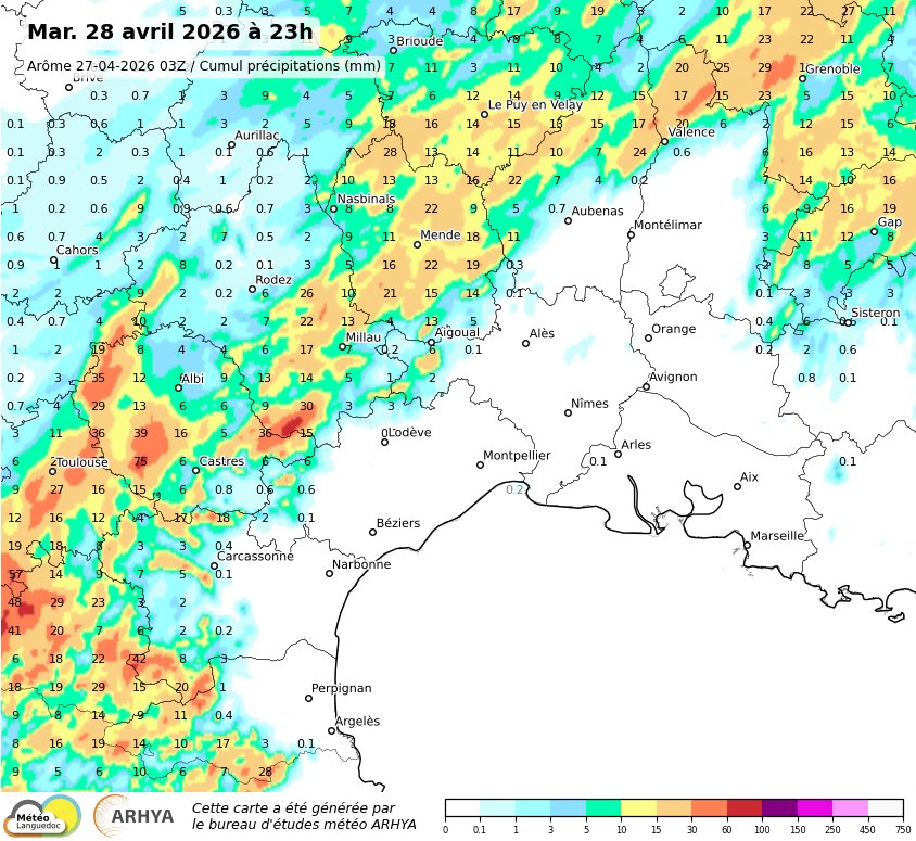 Ce mardi, une dégradation s'opère sur nos régions Méditerranéennes. Elle se caractérise par des nuages nombreux durant la matinée, sauf dans l'Ouest Audois et près des Pyrénées où le soleil peut encore résister un peu. Les premières gouttes ou petites averses peuvent se produire dès le matin en Lozère. En cours d'après-midi, le risque d'orages augmente sensiblement. Il concerne notamment l'Aveyron et la Lozère, où les orages sont parfois nombreux et structurés, pouvant donner de fortes pluies, de la grêle et des rafales de vent > 60 km/h. D'autre part, il affecte de façon plus localisée les Pyrénées, ainsi que les limites Audoises/Tarnaises, avec une sévérité moindre toutefois.