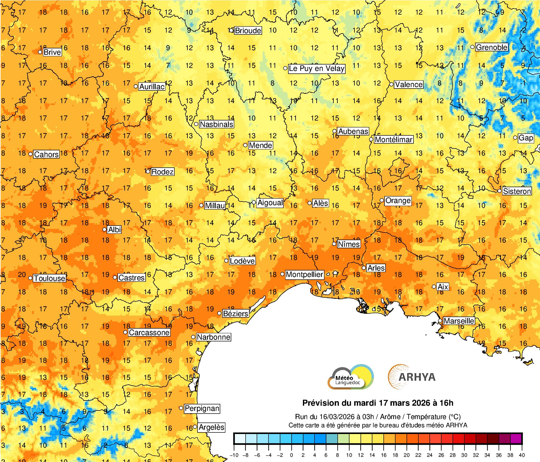 Comme on peut le voir sur la carte ci-dessus, les modélisations sont généralement comprises entre 18 et 19°C mais il est très probable d'avoir 20 à 21°C localement. Ici on parle de températures à l'ombre et à l'abri. Au soleil, le ressenti sera encore plus élevé. Mercredi, un retour d'Est est attendu. En lien avec une goutte froide sur l'Italie, une perturbation atténuée débordera sur la région d'Est en Ouest. Les nuages arriveront par la Provence et le Gard pour gagner l'Hérault et le Roussillon en fin d'après-midi.