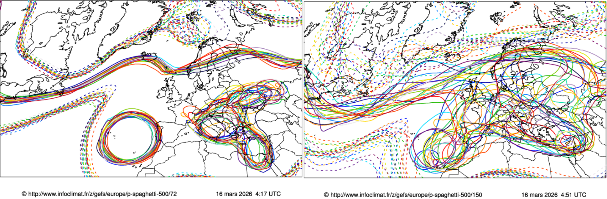 Ci-dessus, chaque trait représente un scénario possible. Sur la carte de gauche (valable pour jeudi), on voit que les traits sont resserrés, ce qui montre une bonne fiabilité avec des scénarios proches les uns des autres. À l'inverse, la carte de droite (valable pour dimanche), c'est bien plus en désordre et on voit que les scénarios divergent. Il est alors difficile de trancher sur une prévision. Des gouttes froides pourraient circuler sous les hautes pressions qui auront tendance à monter vers la Scandinavie.