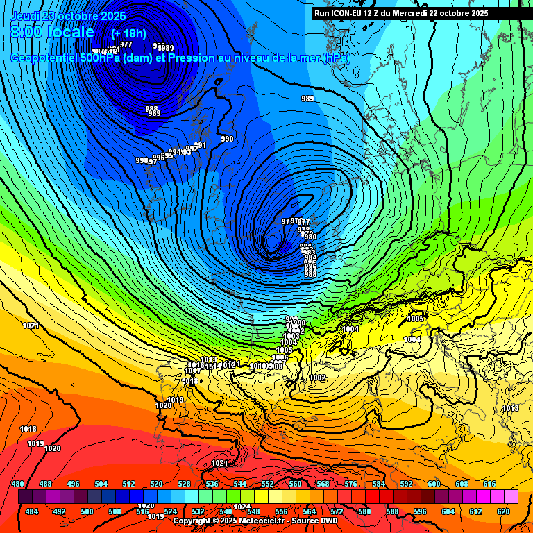 On se retrouve en cette fin de journée pour vos nouvelles prévisions détaillées quant à la tempête attendue dans les prochaines heures. Nous sommes actuellement à mi-chemin entre un anticyclone positionné de l'Afrique du nord à l'Espagne (au sud) et un vaste système dépressionnaire situé au coeur de l'Angleterre. Ce dernier est sous surveillance. En effet, un creusement dépressionnaire secondaire se constitue sur le nord de la Bretagne. Il va évoluer en Manche la nuit prochaine, se creusant rapidement. Cela se caractérise par un abaissement de la pression atmosphérique.