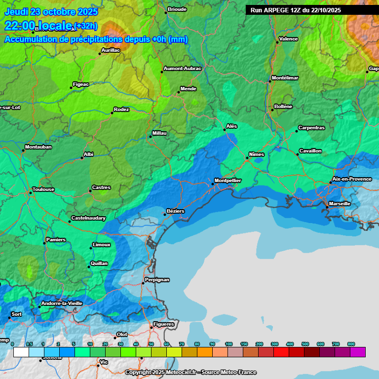 Elles arrivent sous la forme d'averses sur les Pyrénées-Orientales qui reste globalement en marge de cet épisode pluvieux (mais pas venteux). Sur nos plaines, les cumuls sont assez faibles : 0 à 3 mm sur le Roussillon, 2 à 10 mm du sud au nord de l'Aude ainsi que sur l'Hérault, 5 à 10 mm sur le Gard. Les averses s'enchainent toute la journée sur les reliefs. Avec l'arrivée d'air froid, il floconne dès 1400/1500 m sur la Lozère. Le grésil touche temporairement l'Aigoual. Jusqu'à 8h du matin, le vent est plutôt faible, sauf sur l'Aubrac où les rafales atteignent déjà 80/100 km/h. L'aggravation se précise dès le milieu de matinée. Ci-dessous, voici les cumuls estimés par ARPEGE pour demain :