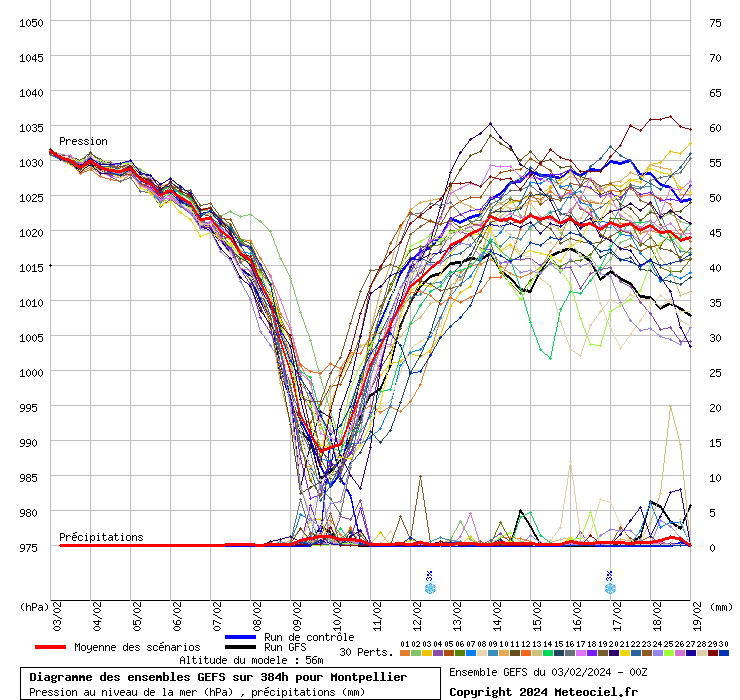 Le diagramme ci-dessus est très parlant. Il montre les scénarios du modèle Américain GFS (chaque tracé est égal à un scénario). La courbe du bas concerne les précipitations tandis que celle du dessus modélise la pression. Il s'agit de Montpellier mais ce constat est valable pour toute la région. On remarque parfaitement l'effondrement des pressions autour dès le 9 février.