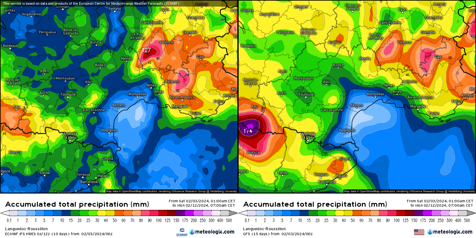 Avec les actualisations de ce week-end, pour l'instant l'axe dépressionnaire n'est pas idéal pour un arrosage généralisé sur notre région. Le Gard et surtout la Lozère seraient les départements les mieux situés tandis que l'Hérault, l'Aude (surtout la moitié Est) ainsi que les Pyrénées-Orientales resteraient bien à l'écart avec des cumuls dérisoires.